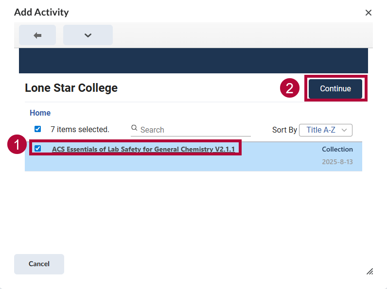- Select the check box [ACS Essentials of Lab Safety] → Select [Continue].