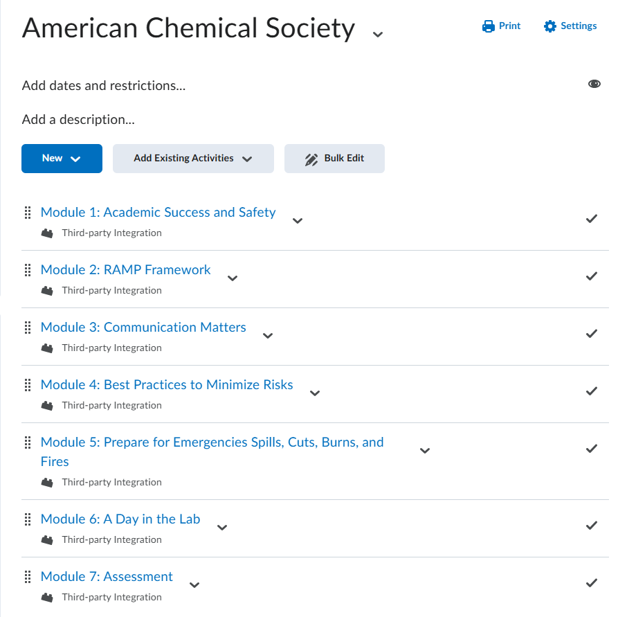 The American Chemical Society integration is currently only available for In-Person Chemistry courses at LSC-University Park. If you wish to use this integration for a course that does not meet this criteria, please contact your Dean or Dept Head and ACS for purchasing information.