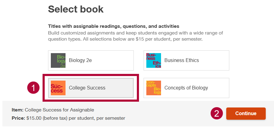- [Select the textbook] you intend to use and select [Continue]. In the example shown, College Success is selected.