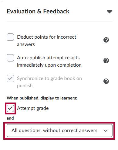 - Verify that the Evaluation & Feedback setting for When published, display to learners is configured to show questions. If the questions are not showing, the rubric will not be visible to students.We recommend selecting [All questions without correct answers].