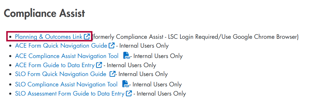 - You will be taken to a list of links at the bottom of the screen. Select the [Planning & Outcomes Link].