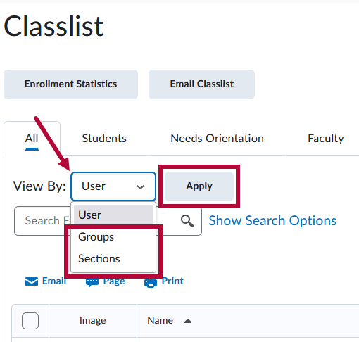 - To view a specific class section or group, click in the View By dropdown list, select [Sections] or [Groups], and click the [Apply] button.