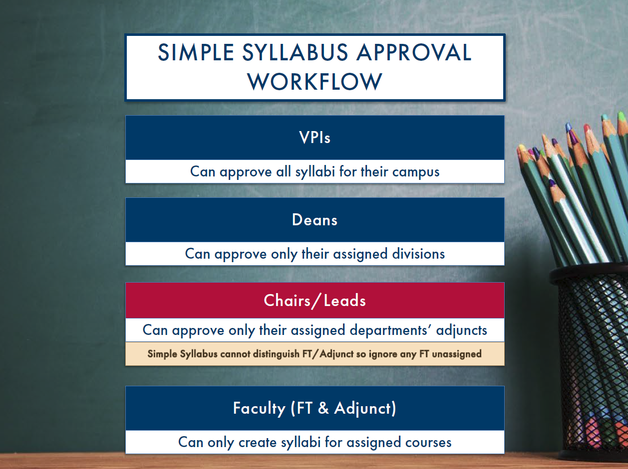This diagram outlines the Simple Syllabus approval workflow and approval scope by role. Approval permissions are hierarchical, with VPs able to approve all syllabi for their campus, followed by Deans, Chairs/Leads, and Faculty, each limited to their assigned divisions, departments, or courses.