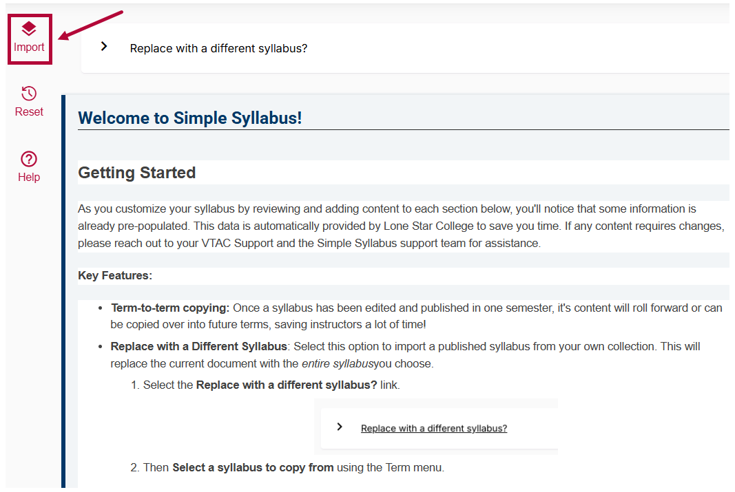 - Once your syllabus is open, select [Import]. Then refer to the Importing Content from Another Syllabus article for next steps.